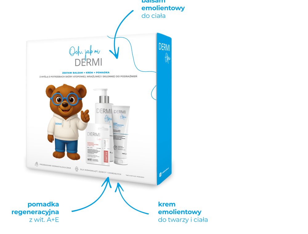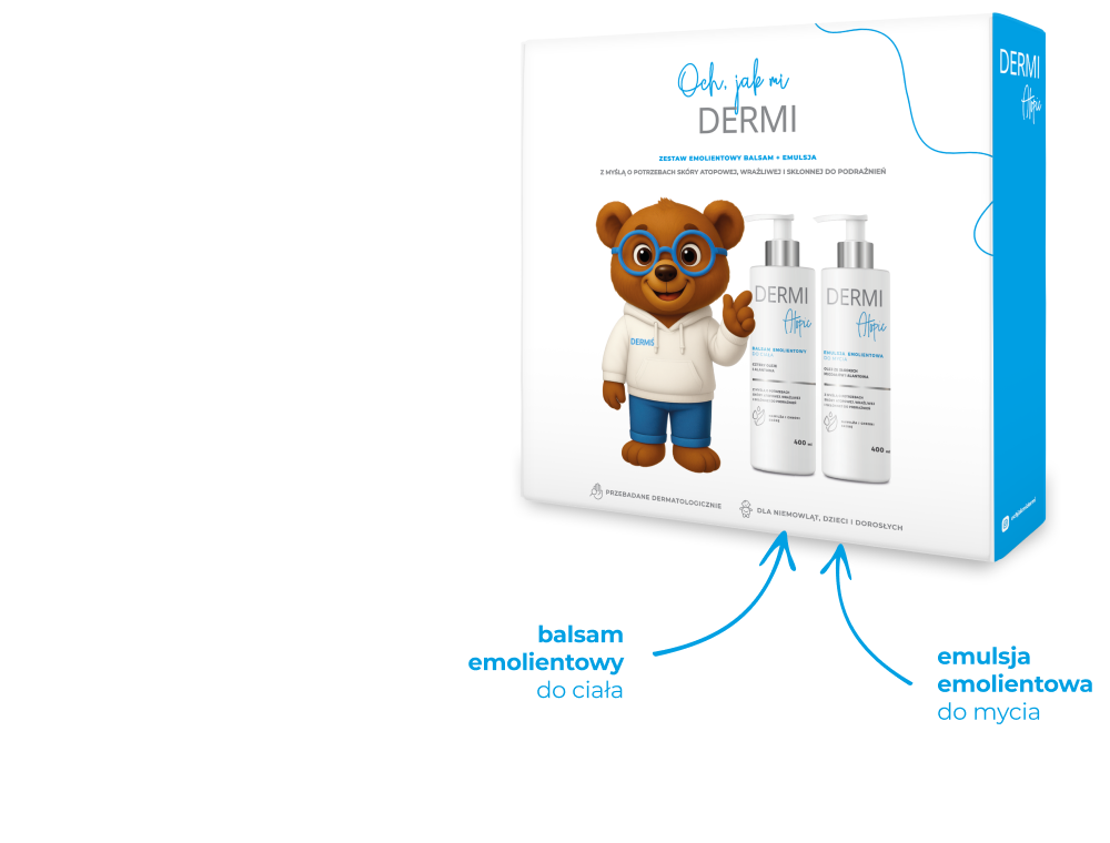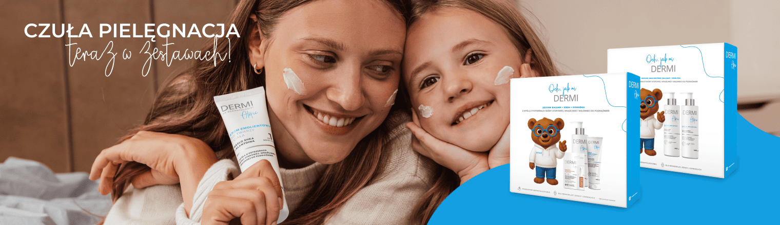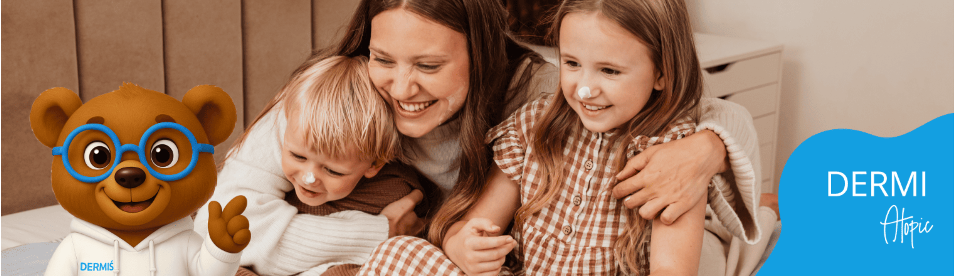 Poznaj DERMI Atopic – dermokosmetyki dla niemowląt, dzieci i dorosłych, które łączą pielęgnację z czułością - już od 1 dnia życia. Delikatne formuły koją i sprawiają, że codzienna pielęgnacja staje się chwilą bliskości – bo miło jest dbać, razem z DERMI.