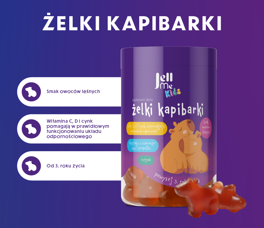 JellMe KIDS to żelki w kształcie uroczych kapibarek, stworzone z myślą o najmłodszych - już od 3. roku życia.